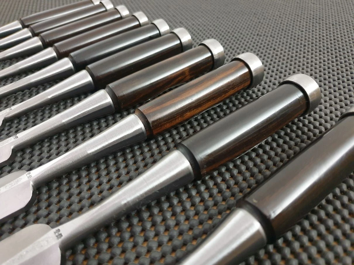 Crafted in laminated Shirogami (white) carbon steel with a 4 groove ura and ebony handle, these stunning umeki-oire nomi (dovetail chisels) are supplied in a 9 piece set.